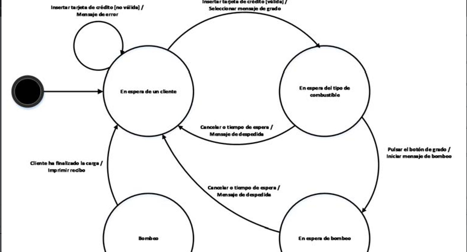 Pregunta 28: Considere el siguiente diagrama de transición de estado para un surtidor de gasolina desatendido, que sólo utiliza tarjeta de crédito como medio de pago: