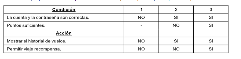 Pregunta 27: Considere la siguiente tabla de decisión para una parte de un sistema de reservas en línea ("online") para líneas aéreas que permite a los viajeros frecuentes canjear los puntos por viajes recompensa: Se supone que hay dos particiones de equivalencia para la condición en la que la cuenta/contraseña correcta no es verdadera, una en la que la cuenta es inválida y otra en la que la cuenta es válida pero la contraseña es inválida. Suponga que sólo hay una partición de equivalencia correspondiente a la condición donde Cuenta/contraseña SI es verdadera, donde tanto la cuenta como la contraseña son válidas. Si usted quiere diseñar pruebas para cubrir las particiones de equivalencia para Cuenta/contraseña SI y también para esta porción de la tabla de decisión, ¿cuál es el número mínimo de pruebas requeridas?
